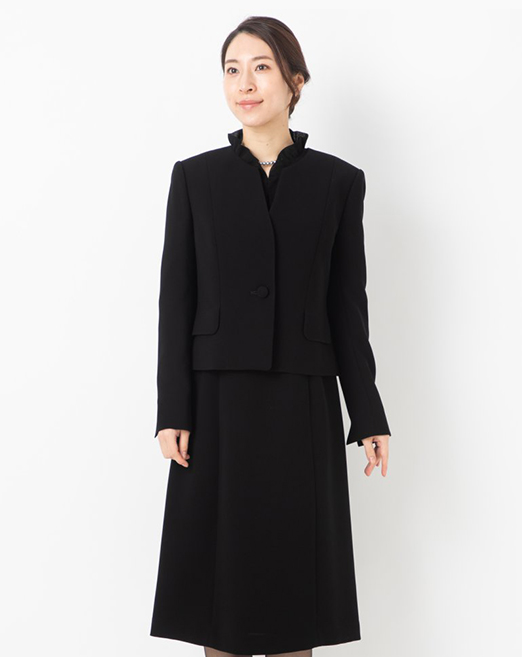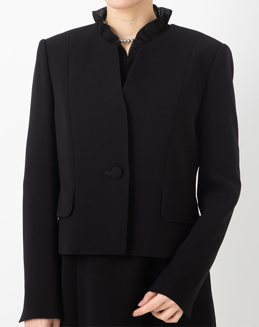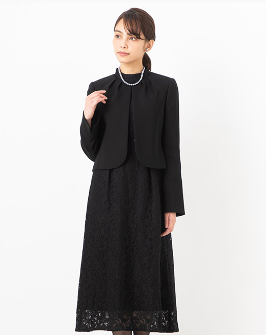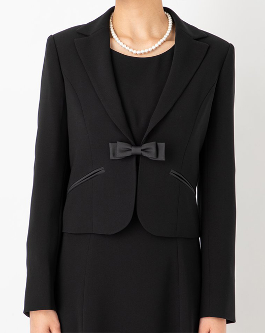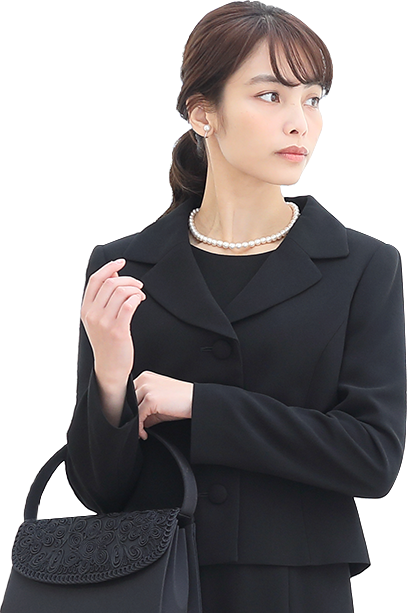 正喪服とは、弔事用の染めが施され、シルクやウールなどの高級素材を使用し、露出と装飾が控えめな黒いワンピーススーツを指します。もっとも高い格式となり、遺族や近い親族が着用する喪服です。